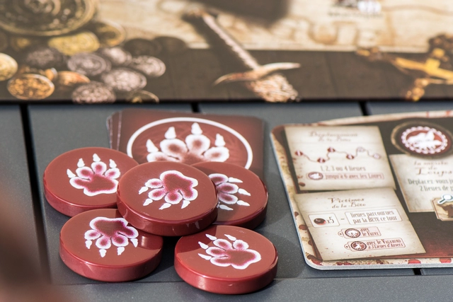 La Bête possède 5 jetons identité (belles grosses pièces en résine). Son identité réelle est cachée sous le plateau et figure donc sur 1 des jetons.