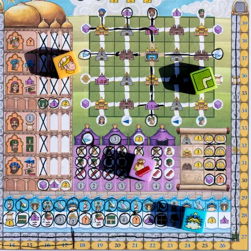 La zone orange : le Palais ! Vos jokers sont là, sous forme de personnages dont un motif rappelle les couleurs du jeu. Si vous voyez une marchande sur le dé orange, hop, vous gagnez une action liée au marché (vendre 2 choses OU en gagner 1 au choix). Et que dire du grand Mogul, lui c'est super joker, vous activez un autre personnage du palais comme bon vous semble.